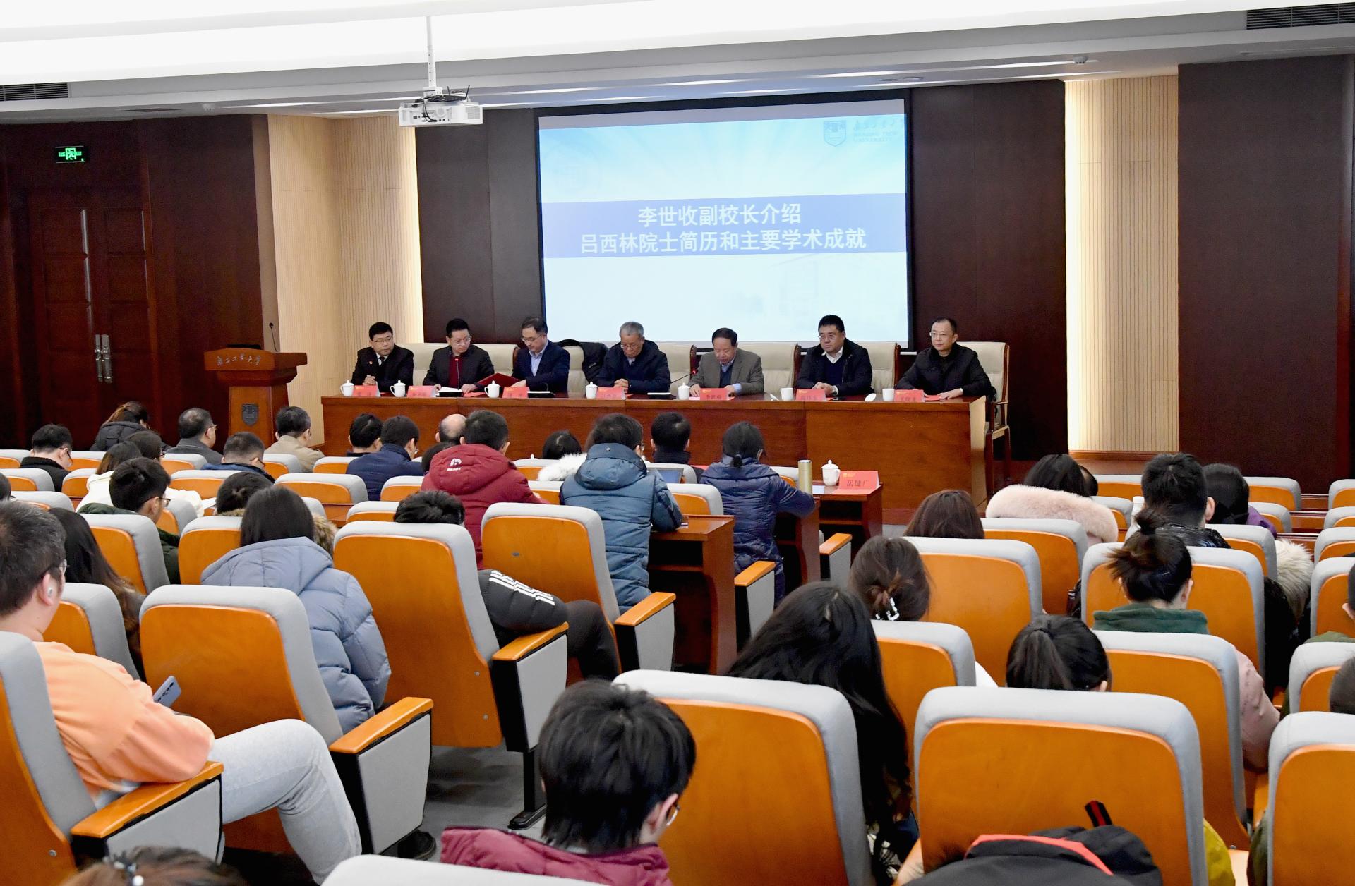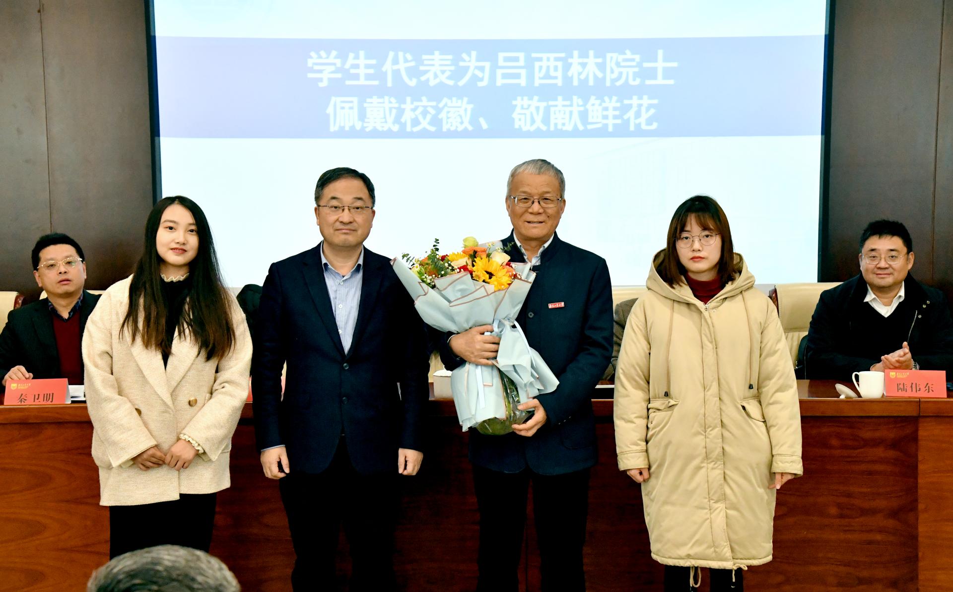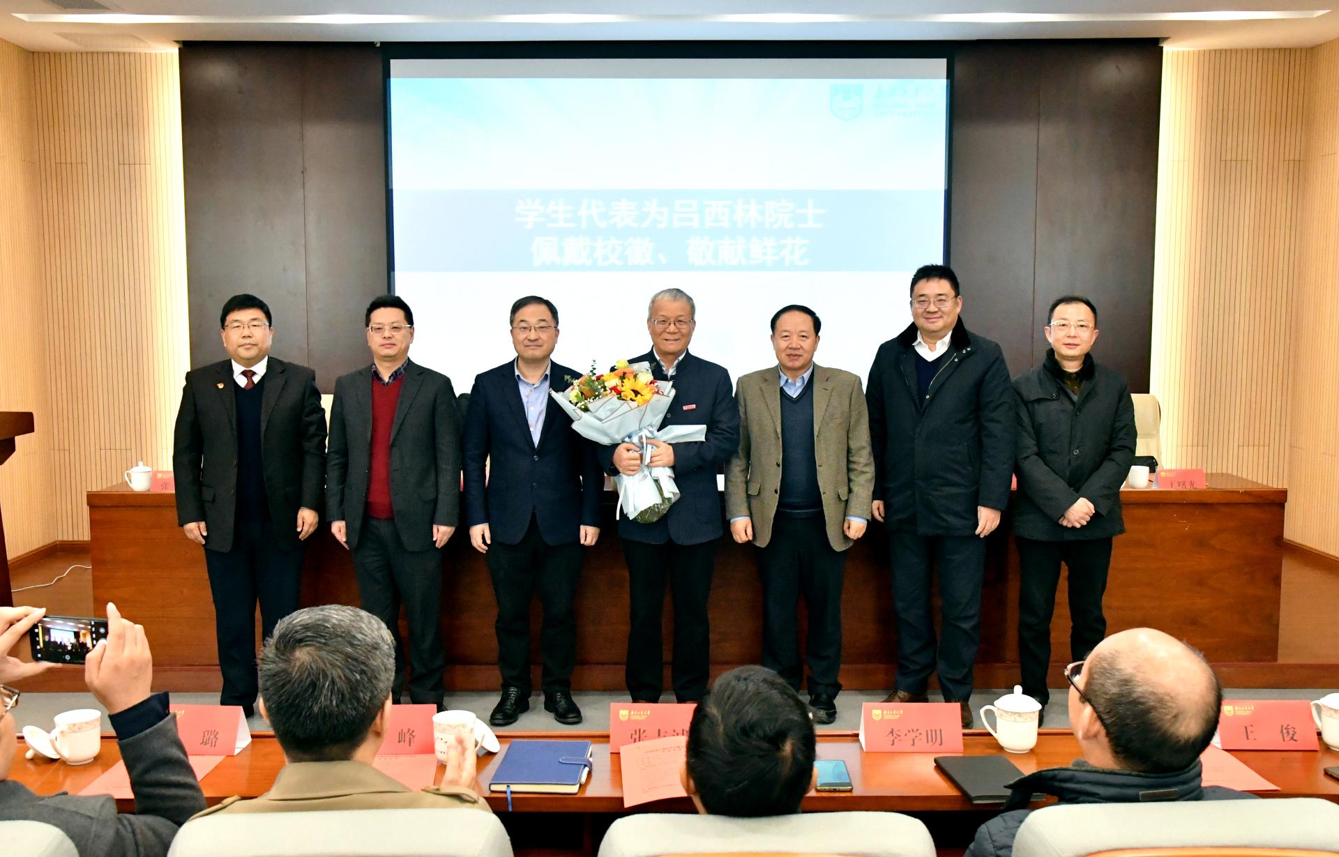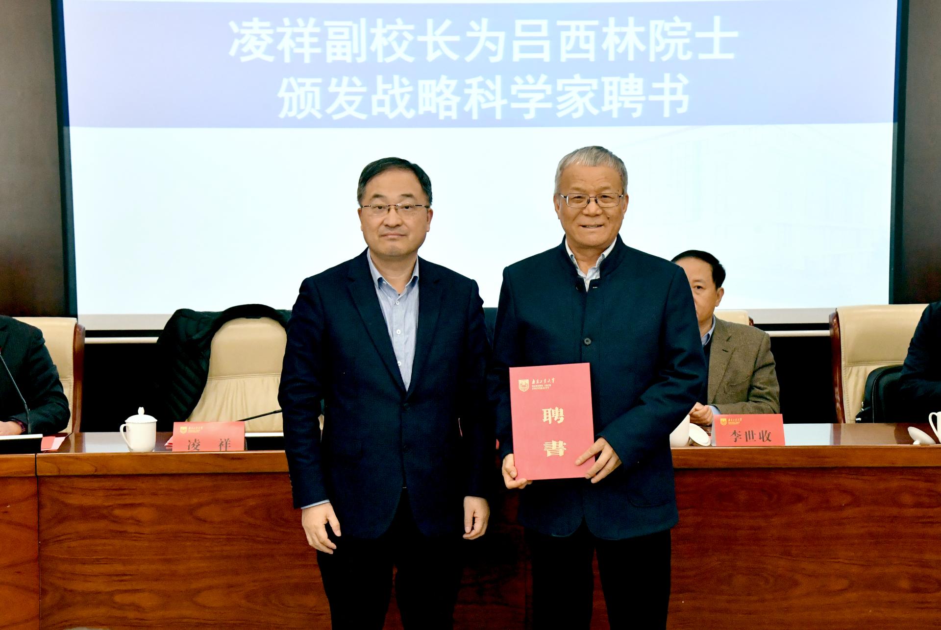 李世收副校长介绍了吕西林院士的简历和在建筑结构抗震及减震领域取得的学术成就,副校长凌祥为吕西林院士颁发了战略科学家聘书,学生代表为吕西林院士佩戴校徽并献花。