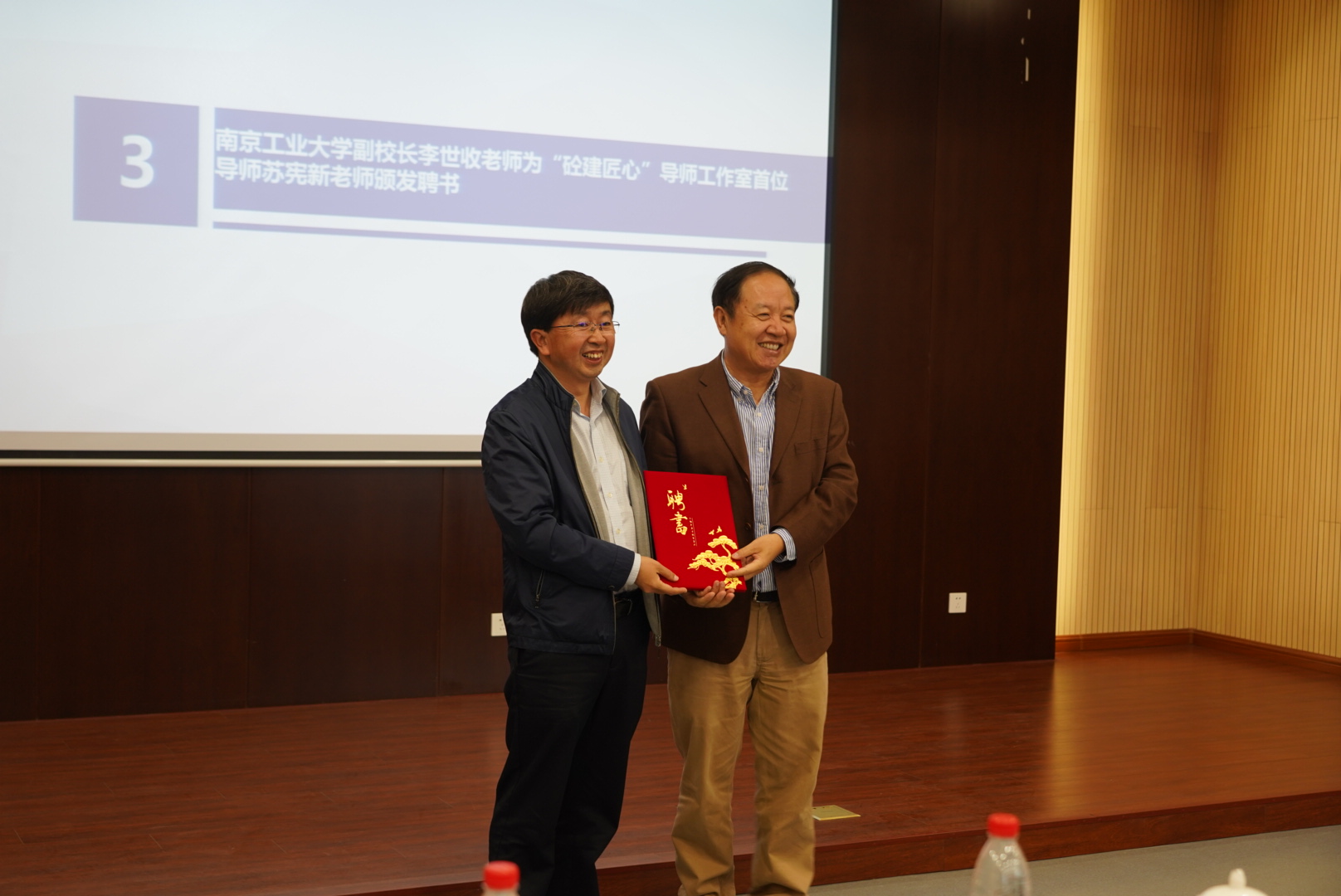 副校长李世收为“砼建匠心”导师工作室首位导师——曾获得全国五一劳动奖章的苏宪新颁发聘书。