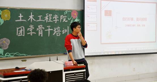 狄远帆老师从加快适应、跟上节奏、坚守初心;奋斗不竭,奉献不止、坚持作为;拓宽胸怀、拓展格局、坚定信仰三个层面展开团学骨干培训,鼓励团学骨干们要适应新时代新形势新要求,树立奋斗青春最美丽的远大理想,践行奉献中实现价值的工作理念,要积极把握工作实践的机遇和平台,扎实锤炼应对困难、解决问题的各项本领。