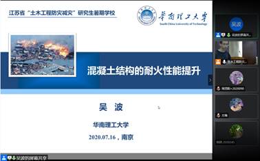 7月16日,2020年江苏省“土木工程防灾减灾”研究生暑期学校进入第四天,5位国内外知名专家通过线上线下混合授课方式给学员们带来了一天精彩的学术盛宴,主要授课内容包括工程结构损伤分析、抗冲击、抗火及智能土木工程等四个方面内容。