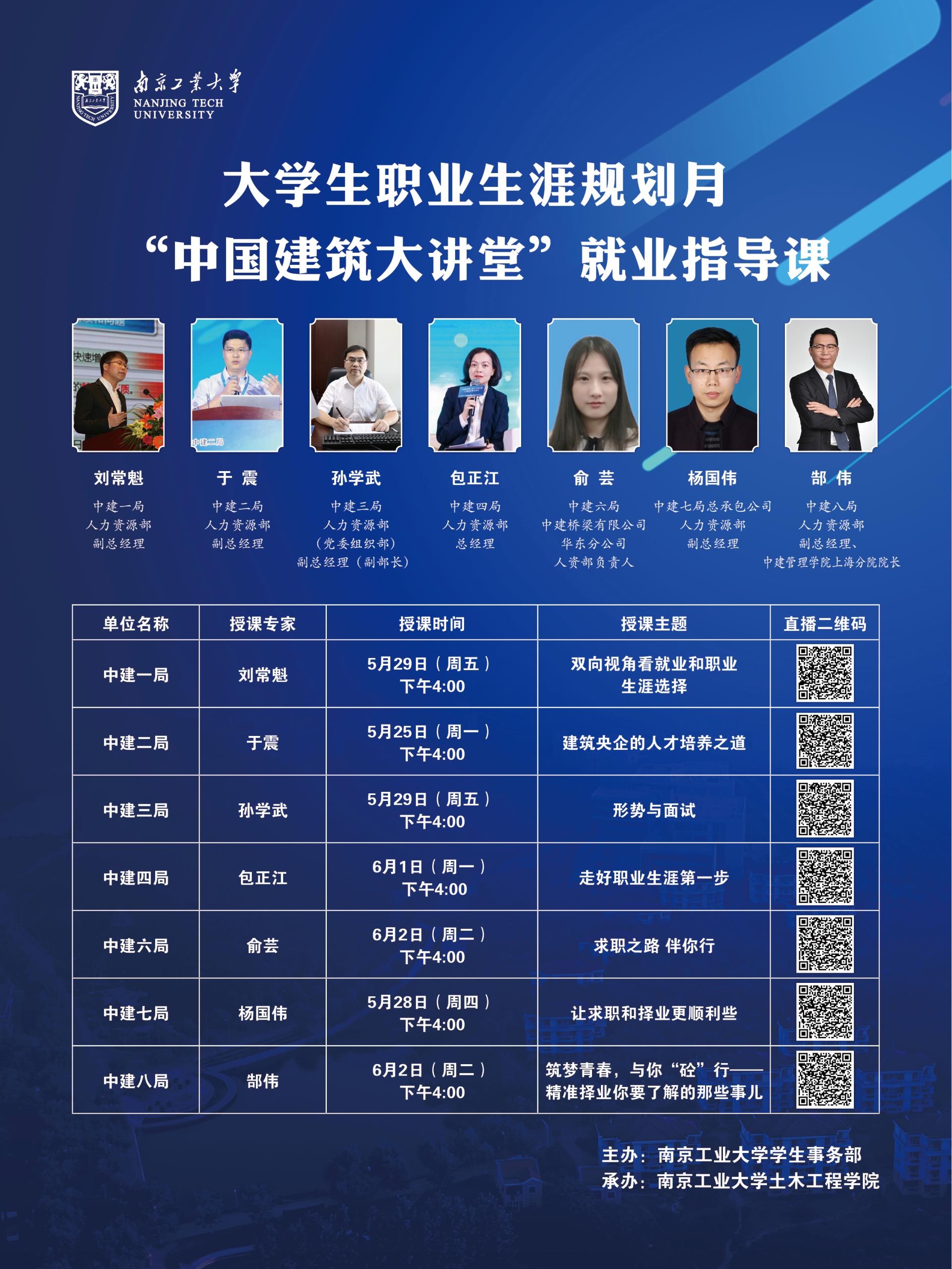 今年全国两会中提出高校要提供不断线的就业服务,“中国建筑大讲堂”是必赢官网直面疫情影响下的就业形势的积极举措之一,后续还将有七场由中建各工程局人力资源专家主讲的高质量讲座陆续推出,继续为在校大学生从理论和实战多角度提供优质就业解读和指导服务,帮助学生了解土建行业的发展趋势,更好地为学生提供高端就业指导服务。